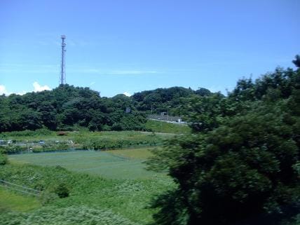 วิวด้านนอกถ่ายจากรถไฟนาริตะเอ็กซ์เพรสก่อนไปถึงสนามบิน